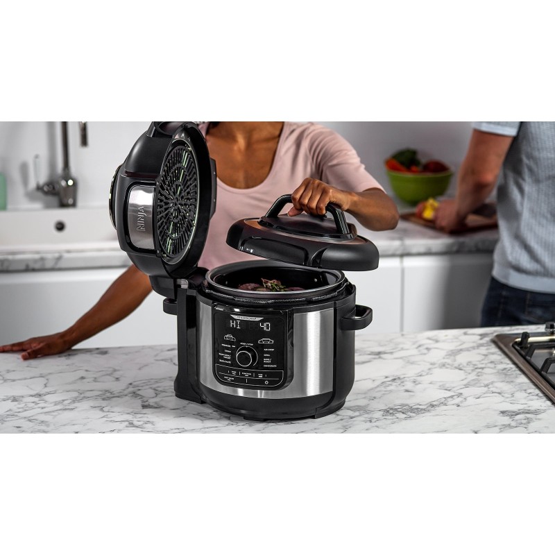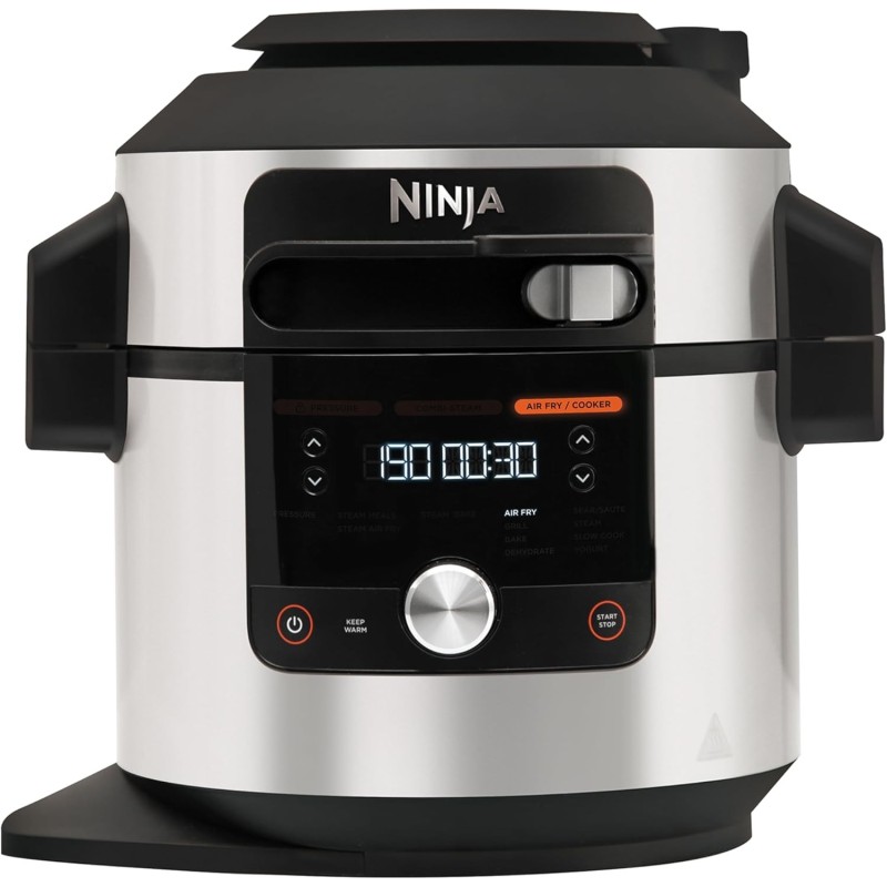 COMPREND : Ninja Foodi 12-en-1 Multicuiseur (prise EU), Pot de cuisson antiadhésif de 7,5 L lavable au lave-vaisselle, Panier Cook et Crisp de 4,7 L, Grille à deux niveaux, Guide de recettes créées par des chefs, Couleur acier inoxydable